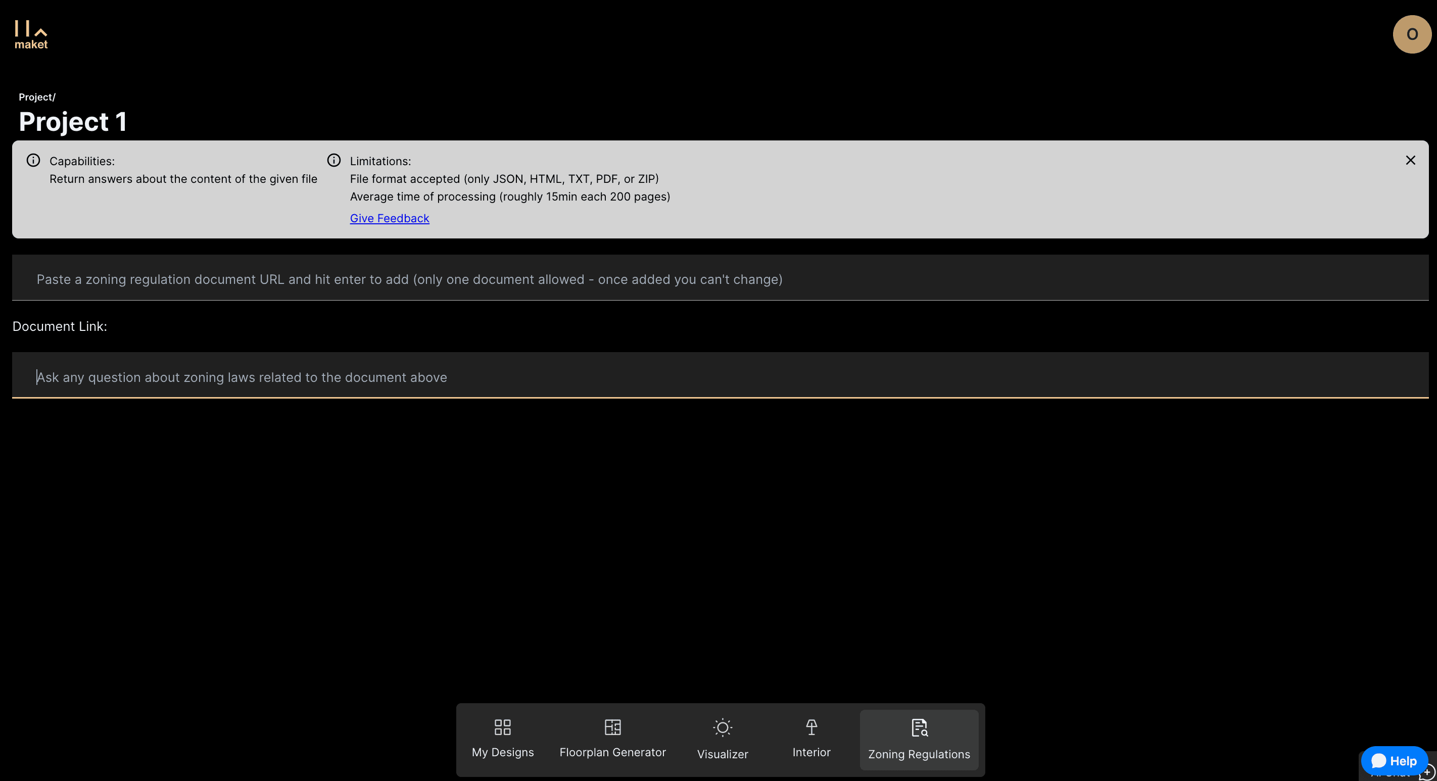 To begin, paste your zoning regulations document into Maket's platform. Ensure that the document is in one of the accepted formats: JSON, HTML, TXT, PDF, or ZIP. Once uploaded, the system will process the document, requiring a short processing time.